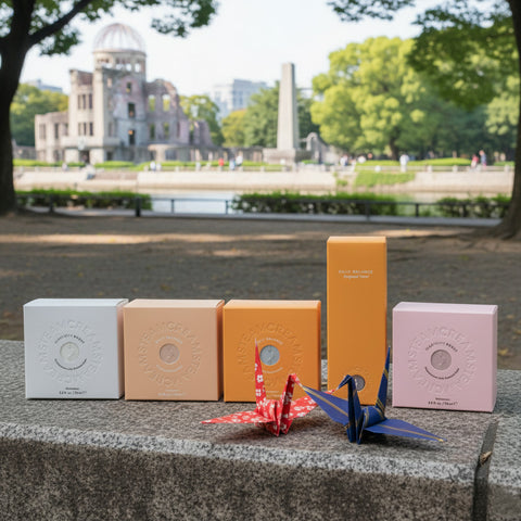 Our paper packaging is made entirely from Colorful Wish®, a special recycled paper created from thousands of origami cranes delivered to Hiroshima and Nagasaki, Japan every year. Each crane is folded by someone, somewhere, wishing for peace.
